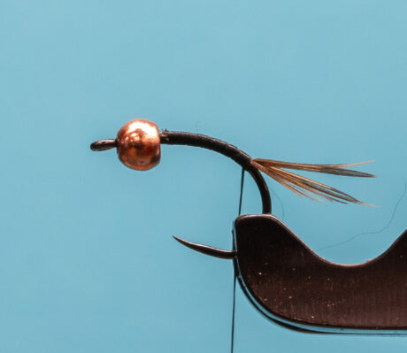 Step2. Take a small clump of pheasant tail, measure the tail appx. ½ the length of the body. Tie in and down on to the bend of the hook. Make a couple of wraps under the tips to prop them up.